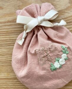 リボン刺繍で「イニシャルとミニバラの巾着ポーチ」をお作りいただける1dayレッスン❤等